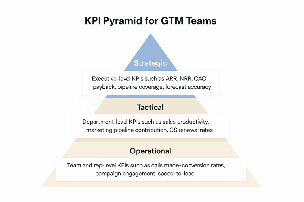- Tactical (middle): Department KPIs such as sales productivity, marketing pipeline contribution, CS renewal rates